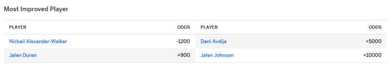 虎扑04月09日讯 今日ESPN官方更新了本赛季的最快进步球员赔率榜单,老鹰球员亚历山大-沃克以-1200居首,活塞球员杰伦-杜伦以+900位居次席。